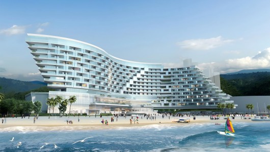 新小梅沙大酒店项目位于深圳市盐田区小梅沙镇盐梅路以南,东临海洋世界,项目由03-04地块(游乐设施用地)和03-05地块(商业用地)两部分地块组成。本酒店成S型横跨两地块上,设计方案采用架空连廊的方式连接两地块之间的功能用房,总建筑面积约6.75万平方米,层数为12~13层。项目建成后将打造成“高端全功能服务酒店”,与新海洋世界项目为小梅沙片区的地标性建筑,代表小梅沙片区的整体形象